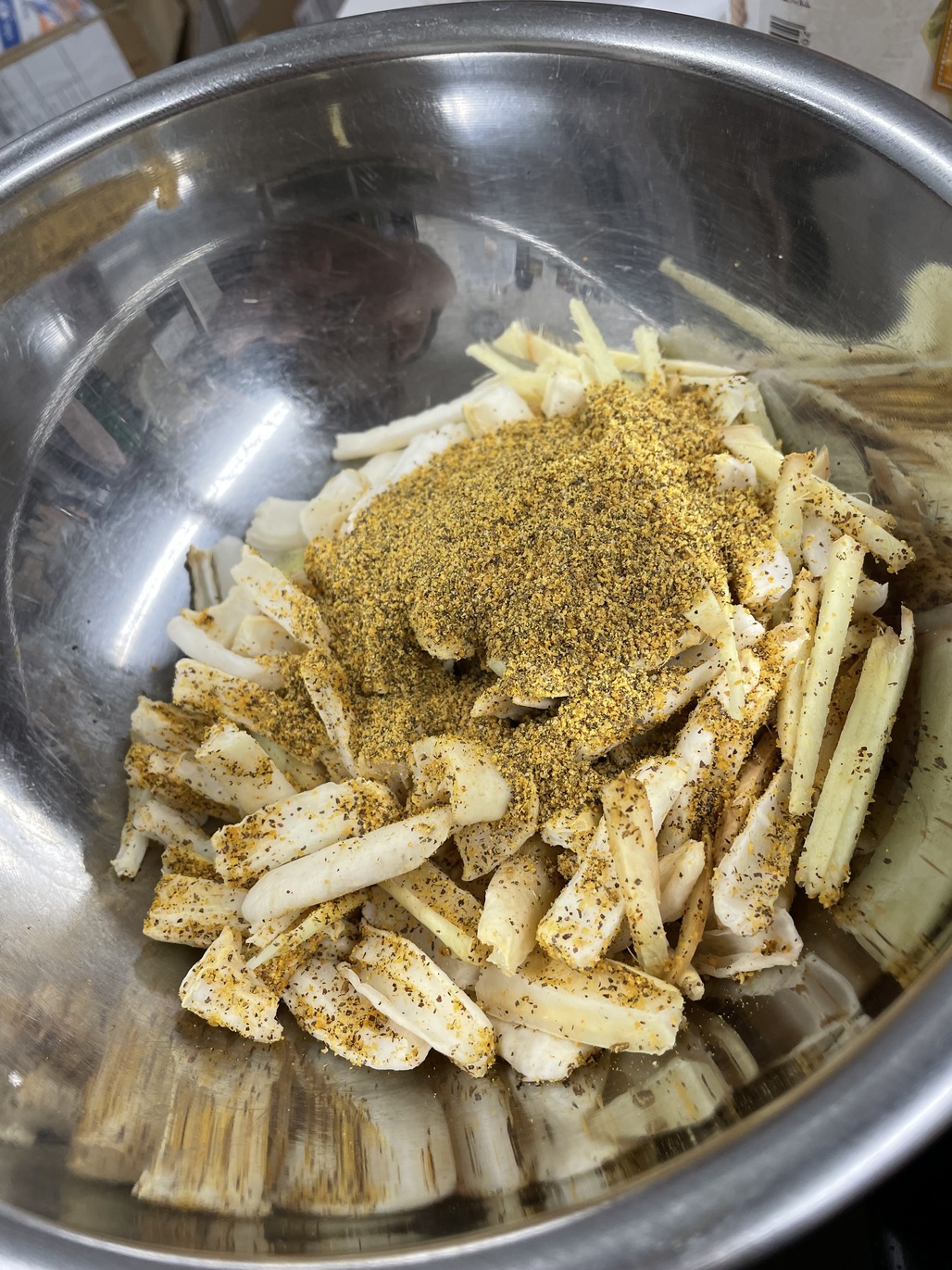 材料の準備が出来たら混ぜます。まずは大根とスパイスをよく混ぜます。